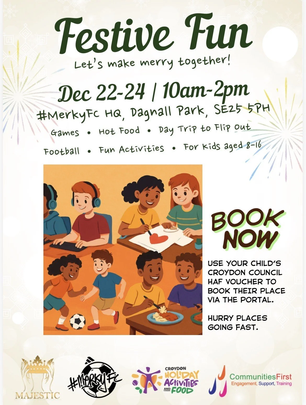 Hosted at #Merky FC HQ (formally Selhurst Sports Arena), the project runs on Monday 22nd December, Tuesday 23rd December and Wednesday 24th December, 10am-2pm, and provides nutritious meals alongside enriching activities such as structured gaming in the EA Games Room, Football, workshops, and a trip to Flip Out, Croydon.