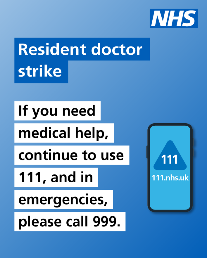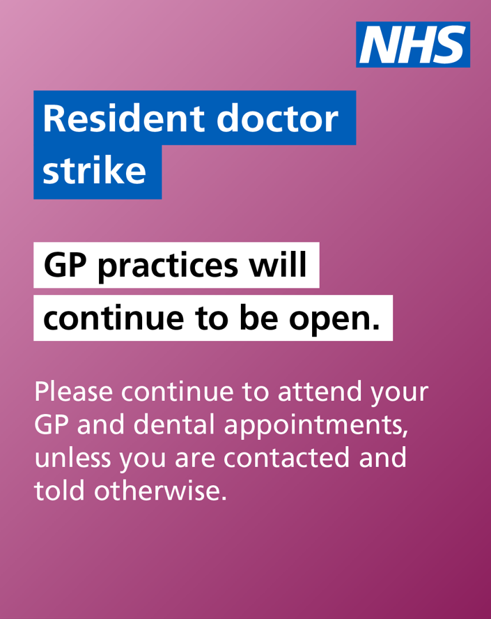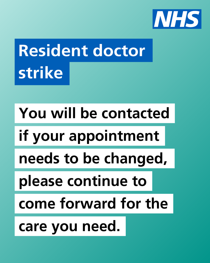During the resident doctor strike, you will be contacted if your appointment needs to change. Please continue to attend appointments unless you are told otherwise.